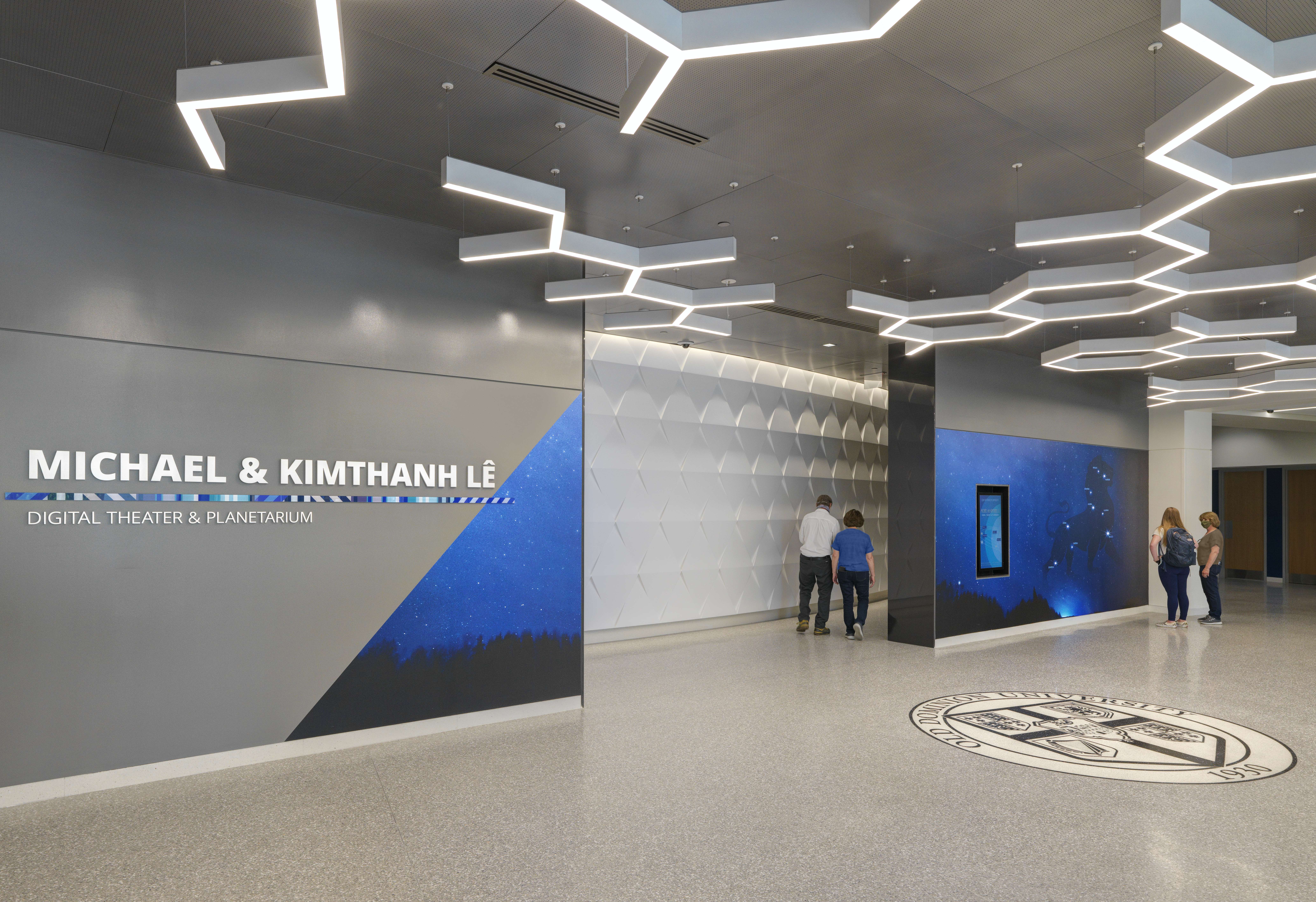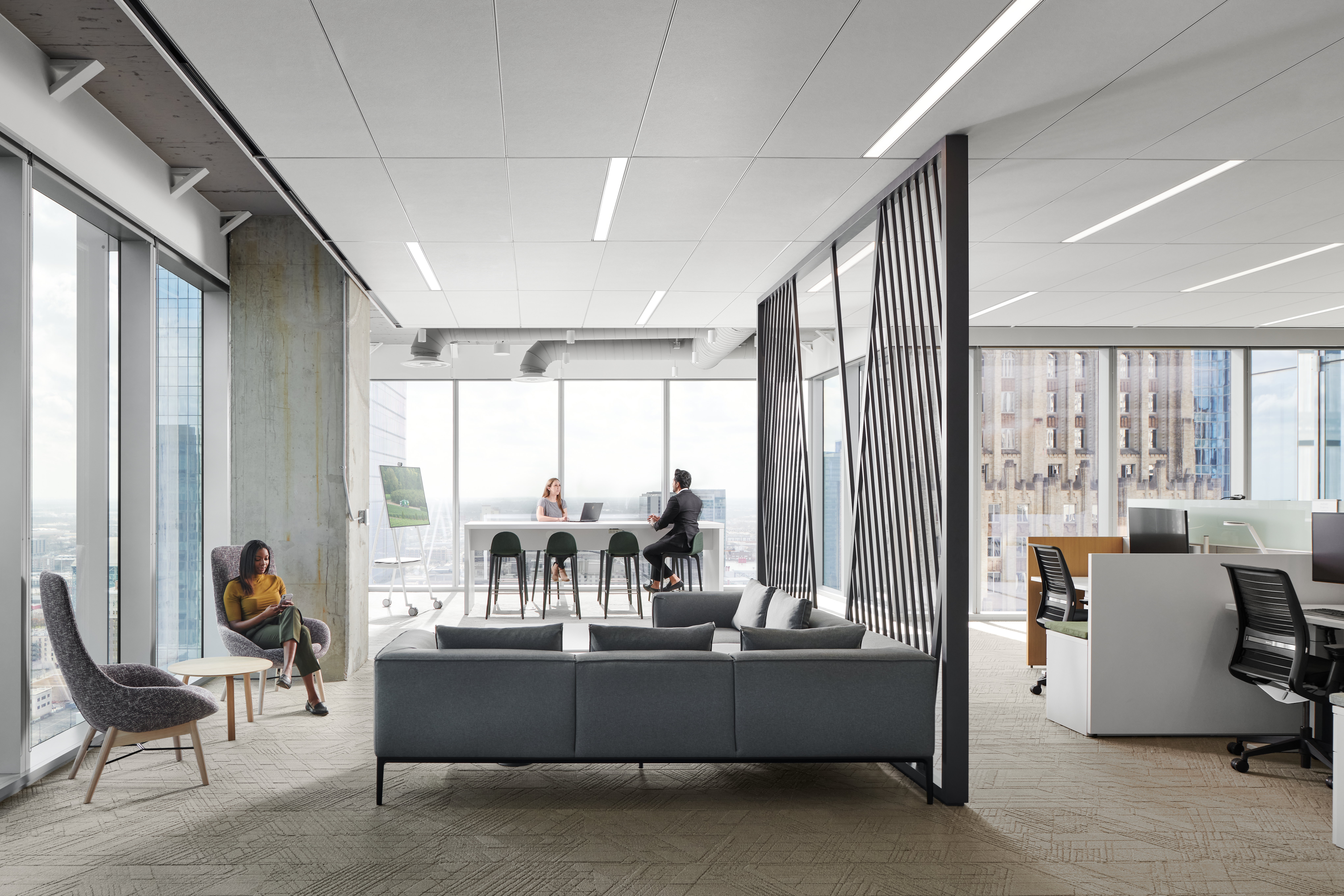 This 360° painted suspension grid creates an open cell ceiling without any unused slotting features of a standard grid system, conveying the intimacy of a lowered ceiling while maintaining an open feel.