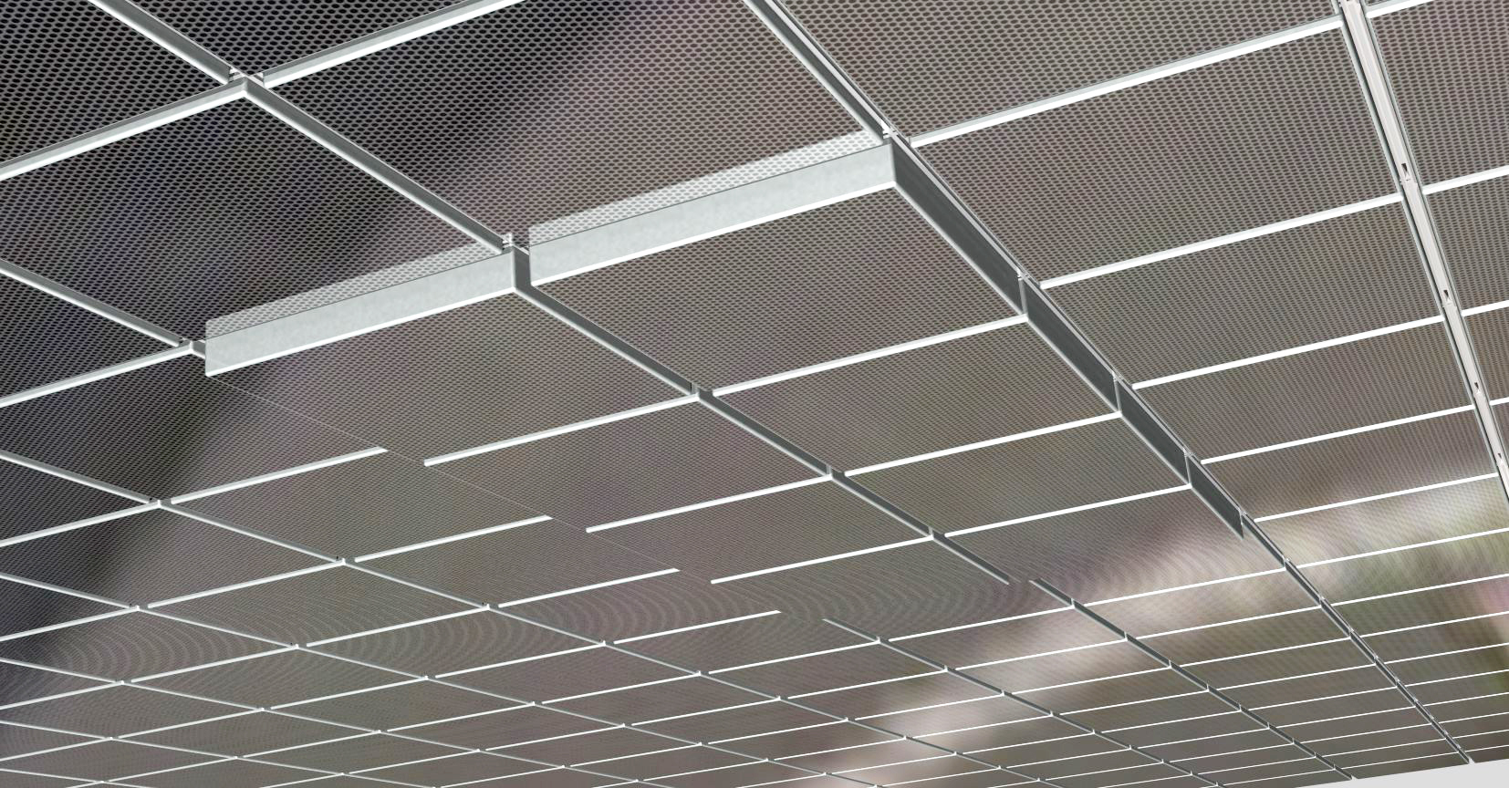 These aluminum ceiling panels conceal the suspension grid utilizing pre-installed torsion springs, providing easy access to the plenum while being suitable for rigorous conditions such as exterior and seismic D, E, F applications.
