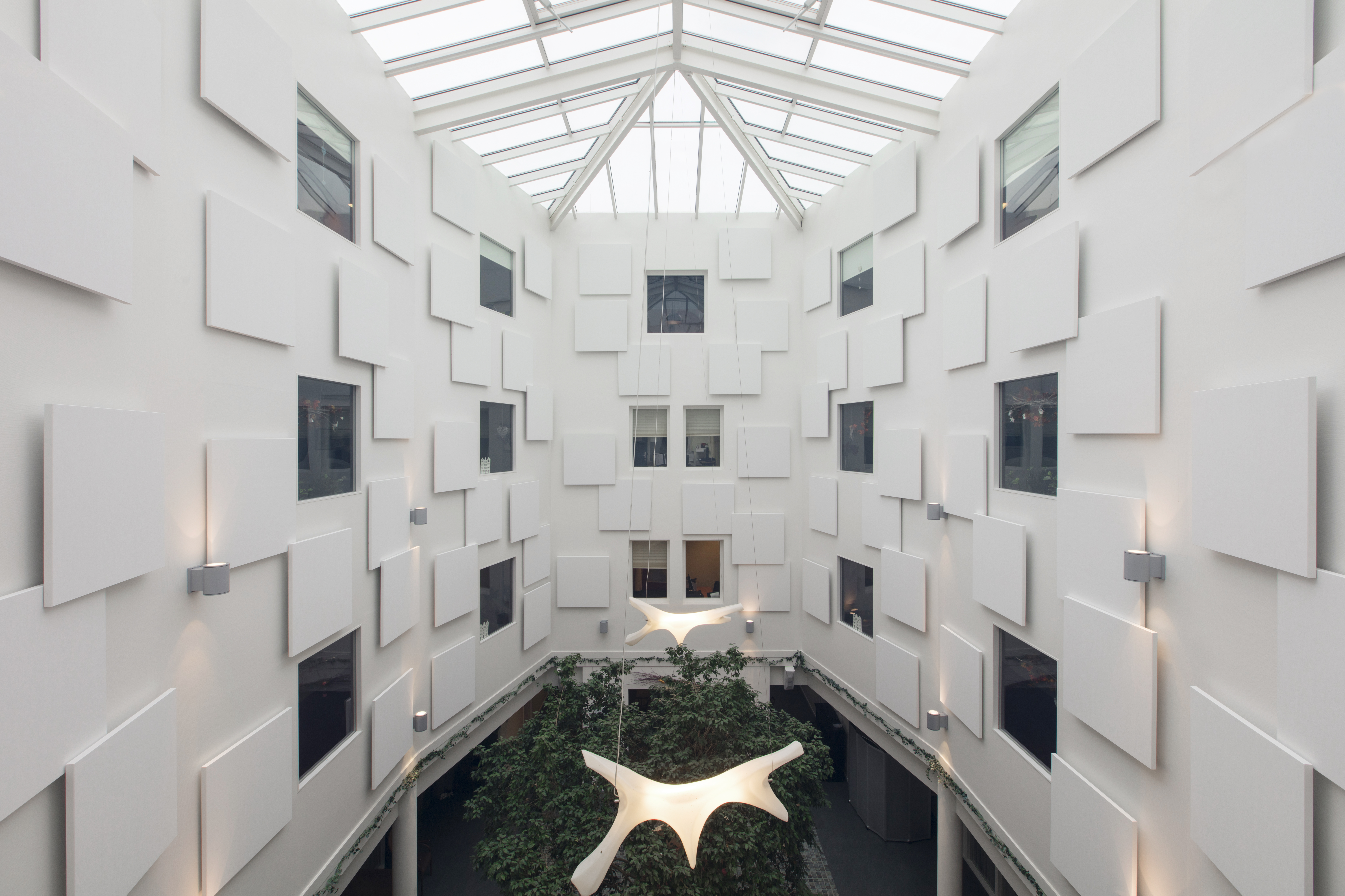 Rockfon® Island™ Wall System features matte bright white acoustic panels ideal for atriums and reception areas, combining elegant design with excellent sound absorption to enhance both aesthetics and acoustic comfort.